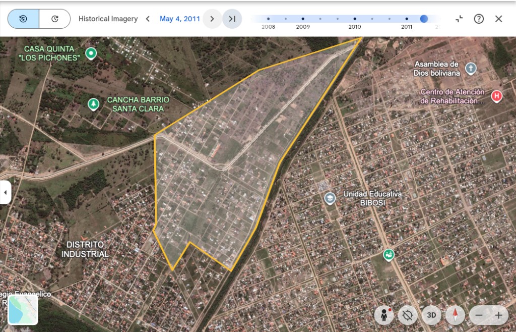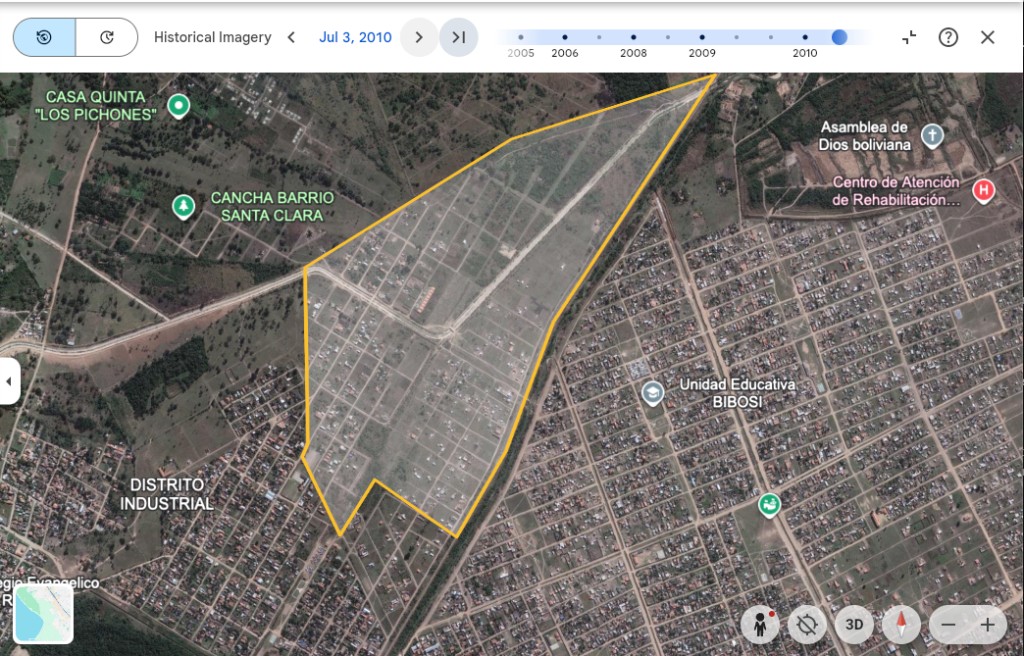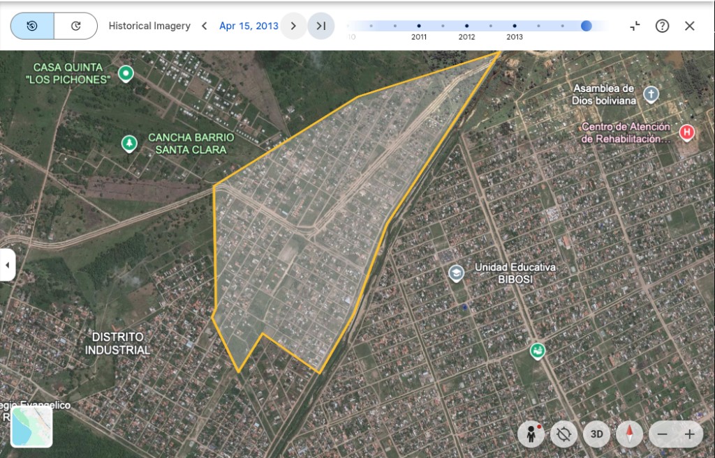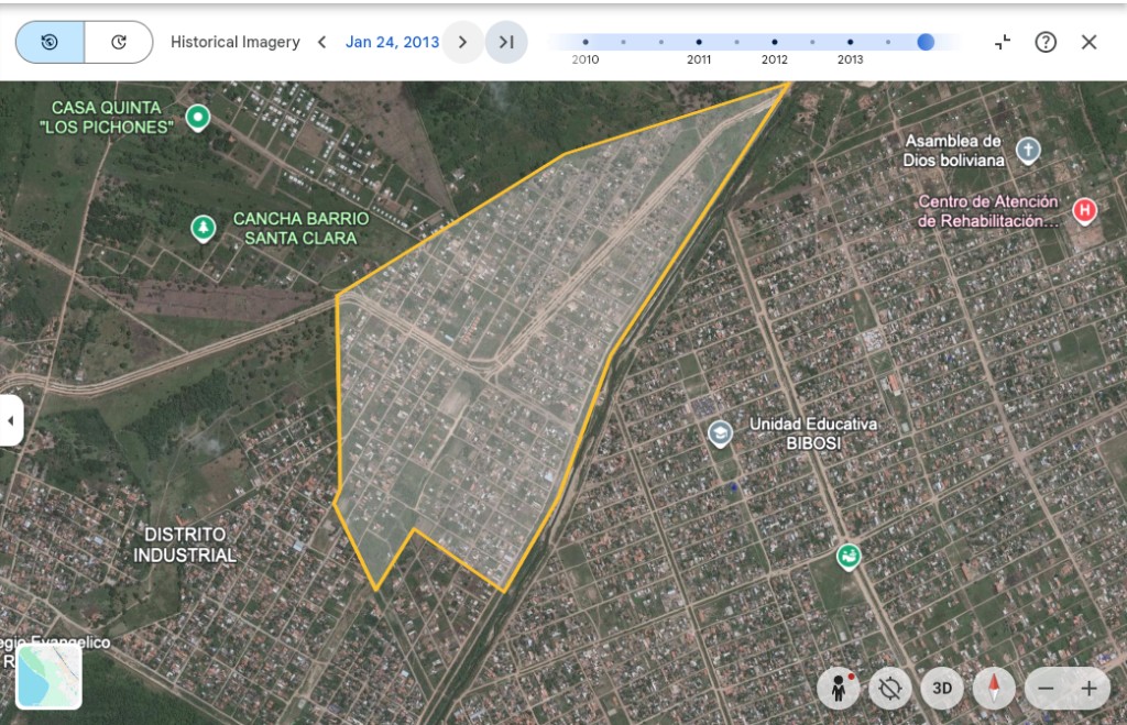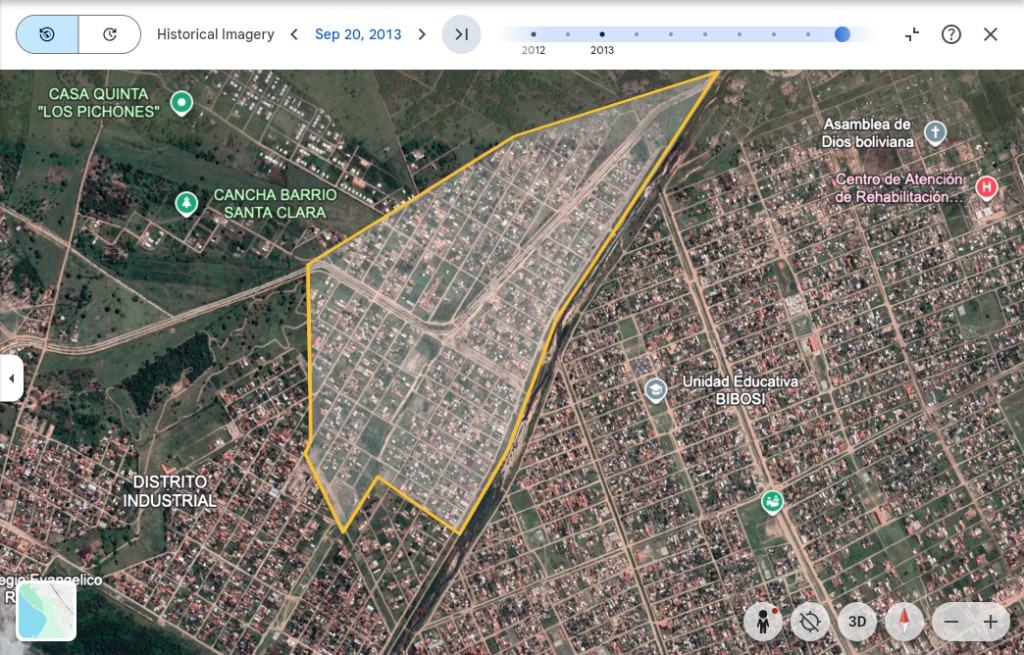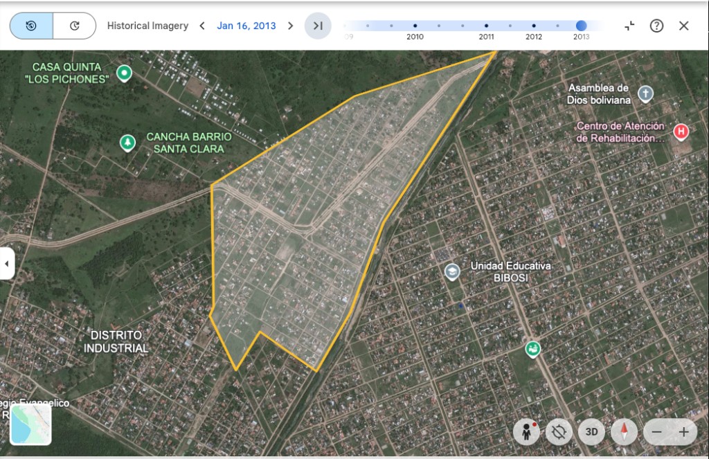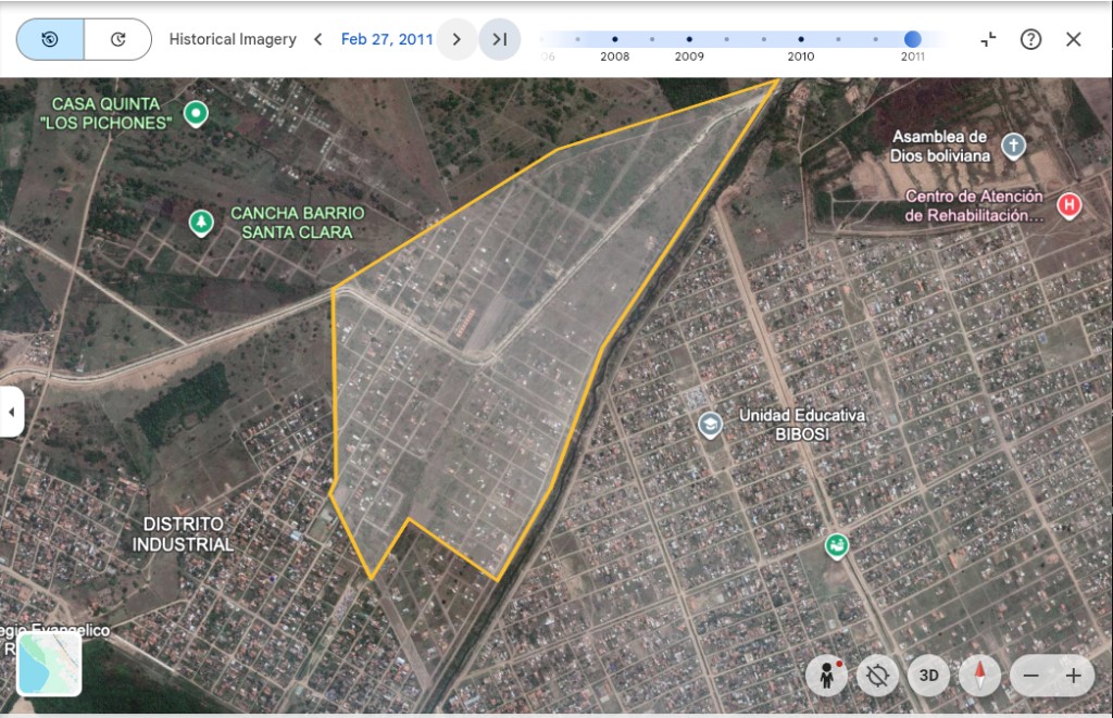 historia-01.pngGoogle Earth, imagen histórica — 14 de diciembre de 2005. Vista A. Predio delimitado; entorno Distrito Industrial, Cancha Barrio Santa Clara, BIBOSI y Canal Chivato.historia-02.pngGoogle Earth, imagen histórica — 14 de diciembre de 2005. Vista B. Predio delimitado; entorno Distrito Industrial, Cancha Barrio Santa Clara, BIBOSI y Canal Chivato.historia-03.pngGoogle Earth, imagen histórica — 27 de enero de 2006. Vista A. Terreno aún poco urbanizado dentro del perímetro.historia-04.pngGoogle Earth, imagen histórica — 27 de enero de 2006. Vista B. Terreno aún poco urbanizado dentro del perímetro.historia-05.pngGoogle Earth, imagen histórica — 25 de mayo de 2006. Vista A. Continúa el trazado y ocupación dispersa.historia-06.pngGoogle Earth, imagen histórica — 25 de mayo de 2006. Vista B. Continúa el trazado y ocupación dispersa.historia-07.pngGoogle Earth, imagen histórica — 15 de agosto de 2008. Vista A. Cuadrícula de calles y primeras construcciones dentro del área.historia-08.pngGoogle Earth, imagen histórica — 15 de agosto de 2008. Vista B. Cuadrícula de calles y primeras construcciones dentro del área.historia-09.pngGoogle Earth, imagen histórica — 17 de abril de 2009. Vista A. Ocupación en desarrollo; límite con zona consolidada al este.historia-10.pngGoogle Earth, imagen histórica — 17 de abril de 2009. Vista B. Ocupación en desarrollo; límite con zona consolidada al este.historia-11.pngGoogle Earth, imagen histórica — 19 de abril de 2009. Vista A. Mismo año; variación de la vista histórica.historia-12.pngGoogle Earth, imagen histórica — 19 de abril de 2009. Vista B. Mismo año; variación de la vista histórica.historia-13.pngGoogle Earth, imagen histórica — 3 de junio de 2009. Vista A. Superposición verde en captura; parcelación visible.historia-14.pngGoogle Earth, imagen histórica — 3 de junio de 2009. Vista B. Superposición verde en captura; parcelación visible.historia-15.pngGoogle Earth, imagen histórica — 3 de julio de 2010. Vista A. Mayor densidad de calles y techos.historia-16.pngGoogle Earth, imagen histórica — 3 de julio de 2010. Vista B. Mayor densidad de calles y techos.historia-17.pngGoogle Earth, imagen histórica — 26 de septiembre de 2010. Vista A. Avance de la malla urbana en el predio.historia-18.pngGoogle Earth, imagen histórica — 26 de septiembre de 2010. Vista B. Avance de la malla urbana en el predio.historia-19.pngGoogle Earth, imagen histórica — 27 de febrero de 2011. Vista A. Más viviendas y calles demarcadas.historia-20.pngGoogle Earth, imagen histórica — 27 de febrero de 2011. Vista B. Más viviendas y calles demarcadas.historia-21.pngGoogle Earth, imagen histórica — 28 de septiembre de 2012. Vista A. Urbanización densa dentro del polígono.historia-22.pngGoogle Earth, imagen histórica — 28 de septiembre de 2012. Vista B. Urbanización densa dentro del polígono.historia-23.pngGoogle Earth, imagen histórica — 21 de enero de 2013. Vista A. Tejido residencial compacto.historia-24.pngGoogle Earth, imagen histórica — 21 de enero de 2013. Vista B. Tejido residencial compacto.historia-25.pngGoogle Earth, imagen histórica — 24 de enero de 2013. Vista A. Segunda toma en 2013; comparar con la anterior.historia-26.pngGoogle Earth, imagen histórica — 24 de enero de 2013. Vista B. Segunda toma en 2013; comparar con la anterior.historia-27.pngGoogle Earth, imagen histórica — 27 de julio de 2013. Vista A. Continuación del proceso de ocupación.historia-28.pngGoogle Earth, imagen histórica — 27 de julio de 2013. Vista B. Continuación del proceso de ocupación.historia-29.pngGoogle Earth, imagen histórica — 28 de julio de 2015. Vista A. Alta densidad edificada en el área marcada.historia-30.pngGoogle Earth, imagen histórica — 28 de julio de 2015. Vista B. Alta densidad edificada en el área marcada.historia-31.pngGoogle Earth, imagen histórica — 23 de octubre de 2019. Vista A. Estado reciente del sector (referencia para el litigio).historia-32.pngGoogle Earth, imagen histórica — 23 de octubre de 2019. Vista B. Estado reciente del sector (referencia para el litigio).