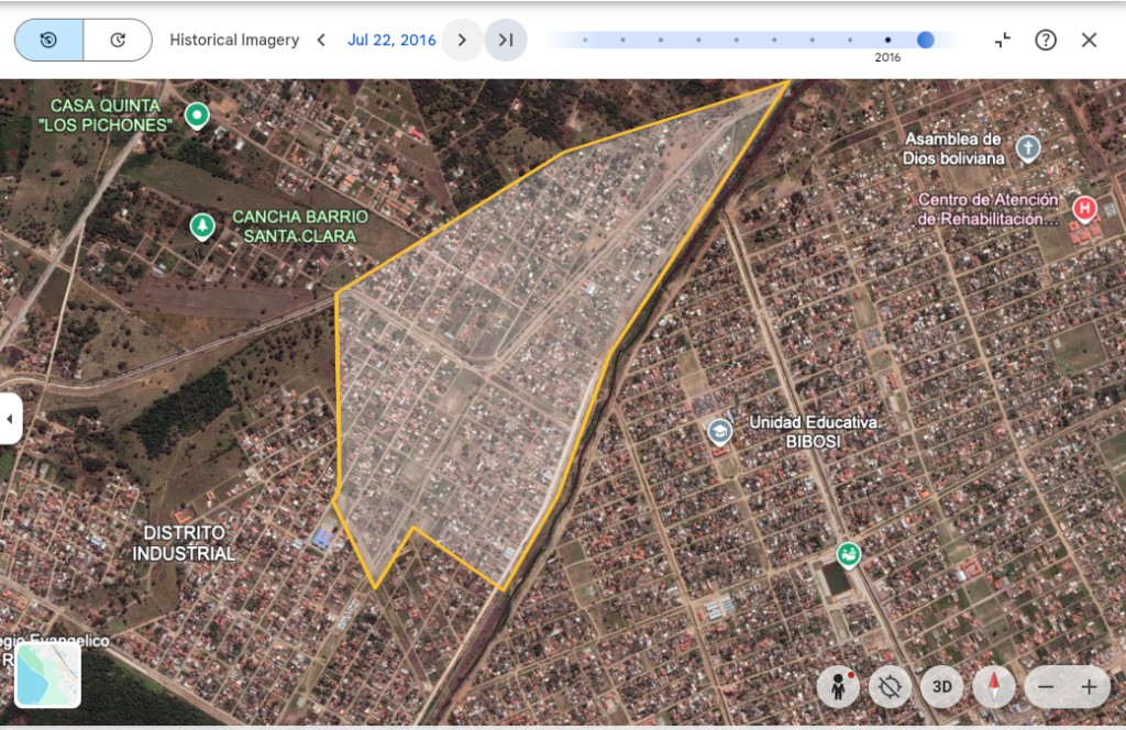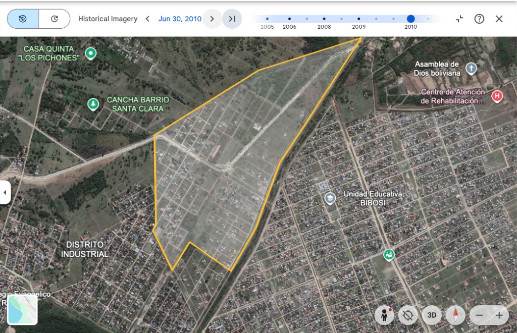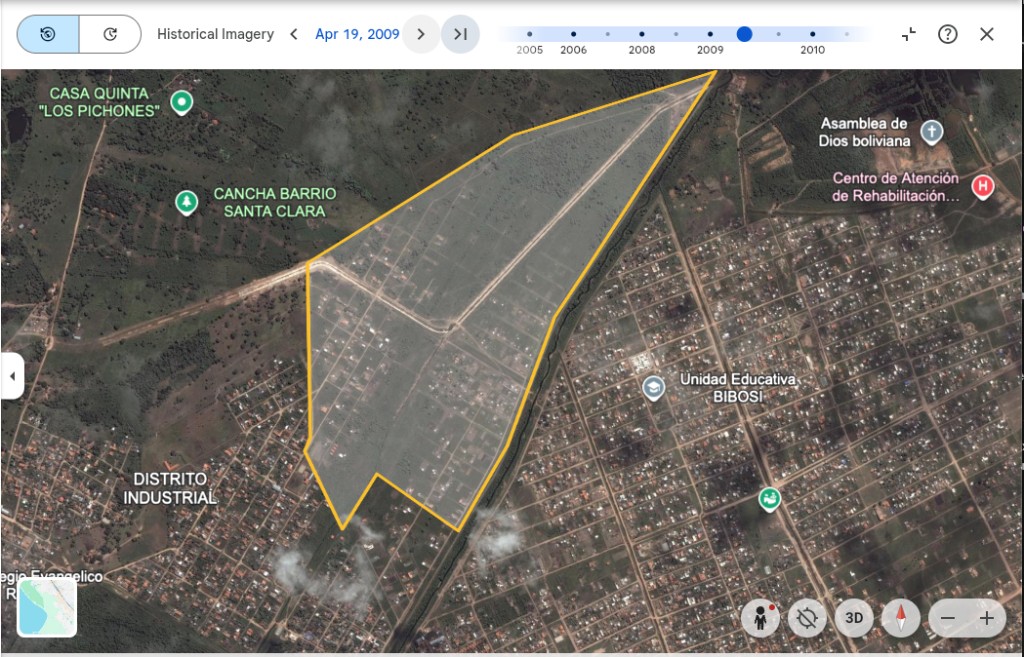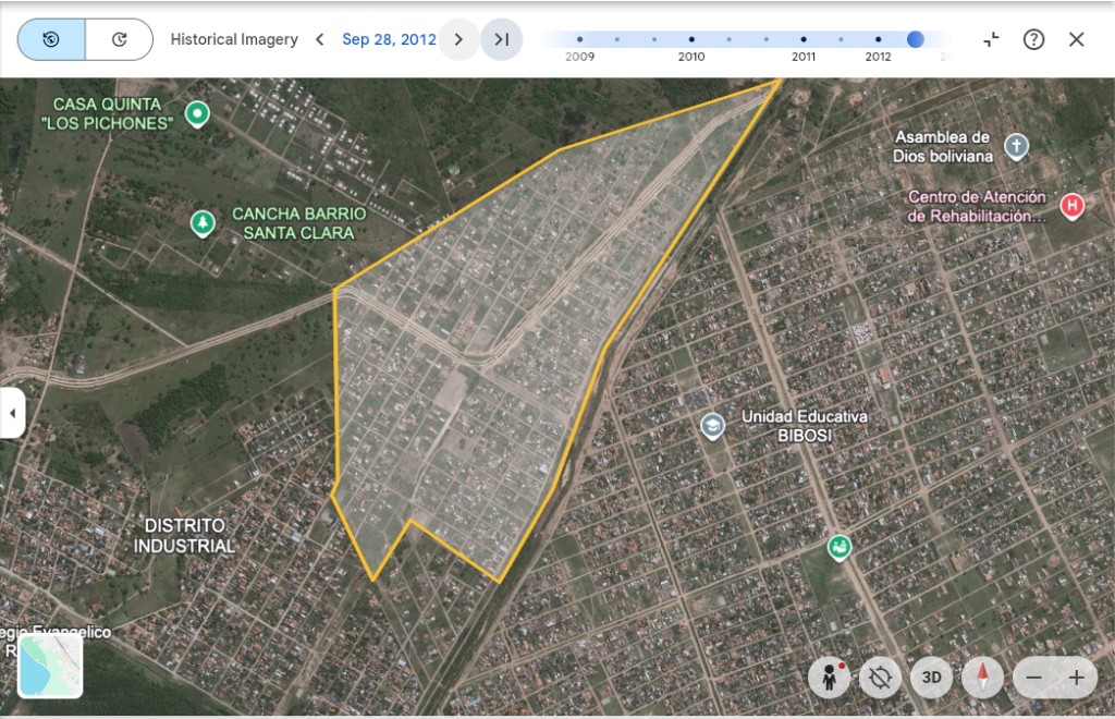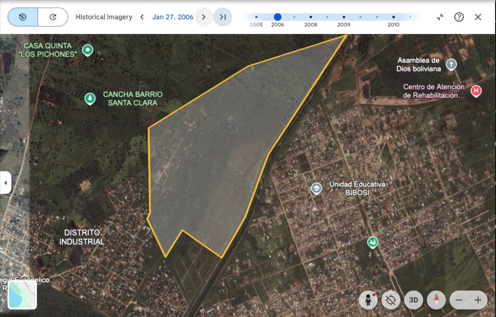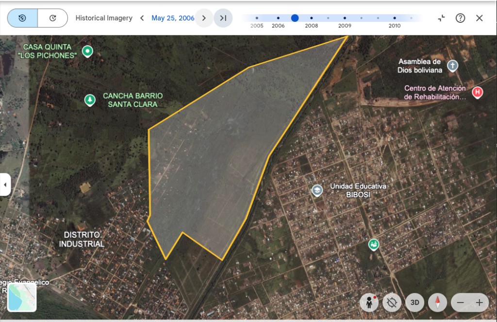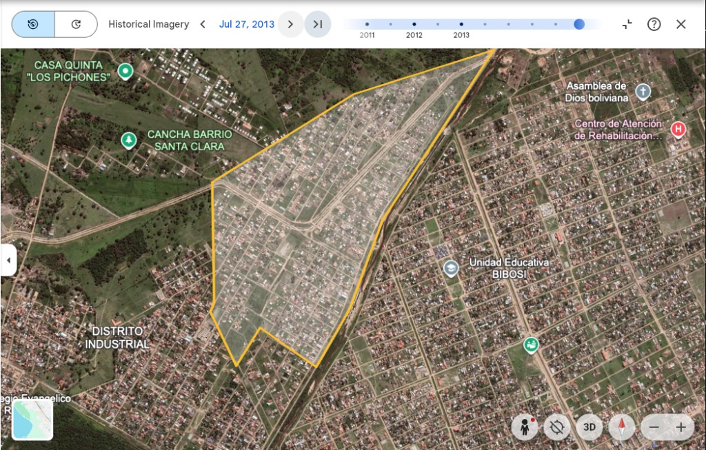 historia-01.pngGoogle Earth, imagen histórica — 14 de diciembre de 2005. Vista A. Predio delimitado; entorno Distrito Industrial, Cancha Barrio Santa Clara, BIBOSI y Canal Chivato.historia-02.pngGoogle Earth, imagen histórica — 14 de diciembre de 2005. Vista B. Predio delimitado; entorno Distrito Industrial, Cancha Barrio Santa Clara, BIBOSI y Canal Chivato.historia-03.pngGoogle Earth, imagen histórica — 27 de enero de 2006. Vista A. Terreno aún poco urbanizado dentro del perímetro.historia-04.pngGoogle Earth, imagen histórica — 27 de enero de 2006. Vista B. Terreno aún poco urbanizado dentro del perímetro.historia-05.pngGoogle Earth, imagen histórica — 25 de mayo de 2006. Vista A. Continúa el trazado y ocupación dispersa.historia-06.pngGoogle Earth, imagen histórica — 25 de mayo de 2006. Vista B. Continúa el trazado y ocupación dispersa.historia-07.pngGoogle Earth, imagen histórica — 15 de agosto de 2008. Vista A. Cuadrícula de calles y primeras construcciones dentro del área.historia-08.pngGoogle Earth, imagen histórica — 15 de agosto de 2008. Vista B. Cuadrícula de calles y primeras construcciones dentro del área.historia-09.pngGoogle Earth, imagen histórica — 17 de abril de 2009. Vista A. Ocupación en desarrollo; límite con zona consolidada al este.historia-10.pngGoogle Earth, imagen histórica — 17 de abril de 2009. Vista B. Ocupación en desarrollo; límite con zona consolidada al este.historia-11.pngGoogle Earth, imagen histórica — 19 de abril de 2009. Vista A. Mismo año; variación de la vista histórica.historia-12.pngGoogle Earth, imagen histórica — 19 de abril de 2009. Vista B. Mismo año; variación de la vista histórica.historia-13.pngGoogle Earth, imagen histórica — 3 de junio de 2009. Vista A. Superposición verde en captura; parcelación visible.historia-14.pngGoogle Earth, imagen histórica — 3 de junio de 2009. Vista B. Superposición verde en captura; parcelación visible.historia-15.pngGoogle Earth, imagen histórica — 3 de julio de 2010. Vista A. Mayor densidad de calles y techos.historia-16.pngGoogle Earth, imagen histórica — 3 de julio de 2010. Vista B. Mayor densidad de calles y techos.historia-17.pngGoogle Earth, imagen histórica — 26 de septiembre de 2010. Vista A. Avance de la malla urbana en el predio.historia-18.pngGoogle Earth, imagen histórica — 26 de septiembre de 2010. Vista B. Avance de la malla urbana en el predio.historia-19.pngGoogle Earth, imagen histórica — 27 de febrero de 2011. Vista A. Más viviendas y calles demarcadas.historia-20.pngGoogle Earth, imagen histórica — 27 de febrero de 2011. Vista B. Más viviendas y calles demarcadas.historia-21.pngGoogle Earth, imagen histórica — 28 de septiembre de 2012. Vista A. Urbanización densa dentro del polígono.historia-22.pngGoogle Earth, imagen histórica — 28 de septiembre de 2012. Vista B. Urbanización densa dentro del polígono.historia-23.pngGoogle Earth, imagen histórica — 21 de enero de 2013. Vista A. Tejido residencial compacto.historia-24.pngGoogle Earth, imagen histórica — 21 de enero de 2013. Vista B. Tejido residencial compacto.historia-25.pngGoogle Earth, imagen histórica — 24 de enero de 2013. Vista A. Segunda toma en 2013; comparar con la anterior.historia-26.pngGoogle Earth, imagen histórica — 24 de enero de 2013. Vista B. Segunda toma en 2013; comparar con la anterior.historia-27.pngGoogle Earth, imagen histórica — 27 de julio de 2013. Vista A. Continuación del proceso de ocupación.historia-28.pngGoogle Earth, imagen histórica — 27 de julio de 2013. Vista B. Continuación del proceso de ocupación.historia-29.pngGoogle Earth, imagen histórica — 28 de julio de 2015. Vista A. Alta densidad edificada en el área marcada.historia-30.pngGoogle Earth, imagen histórica — 28 de julio de 2015. Vista B. Alta densidad edificada en el área marcada.historia-31.pngGoogle Earth, imagen histórica — 23 de octubre de 2019. Vista A. Estado reciente del sector (referencia para el litigio).historia-32.pngGoogle Earth, imagen histórica — 23 de octubre de 2019. Vista B. Estado reciente del sector (referencia para el litigio).