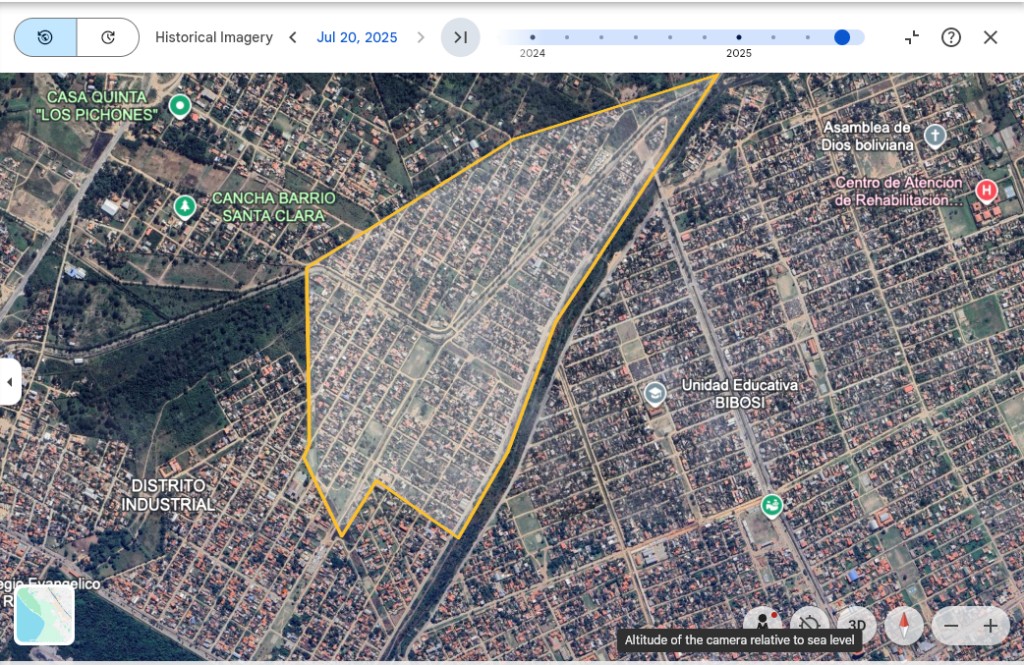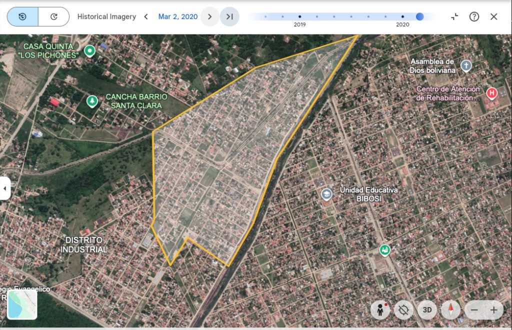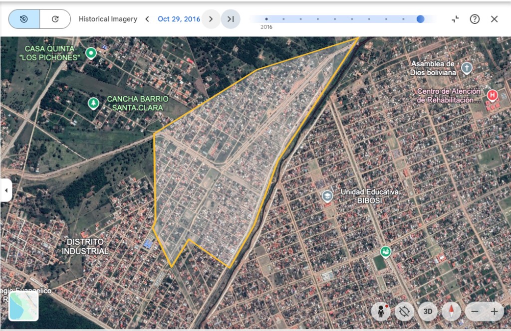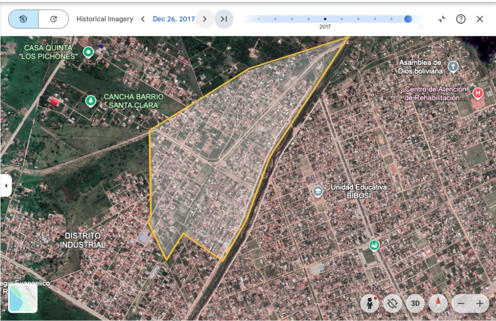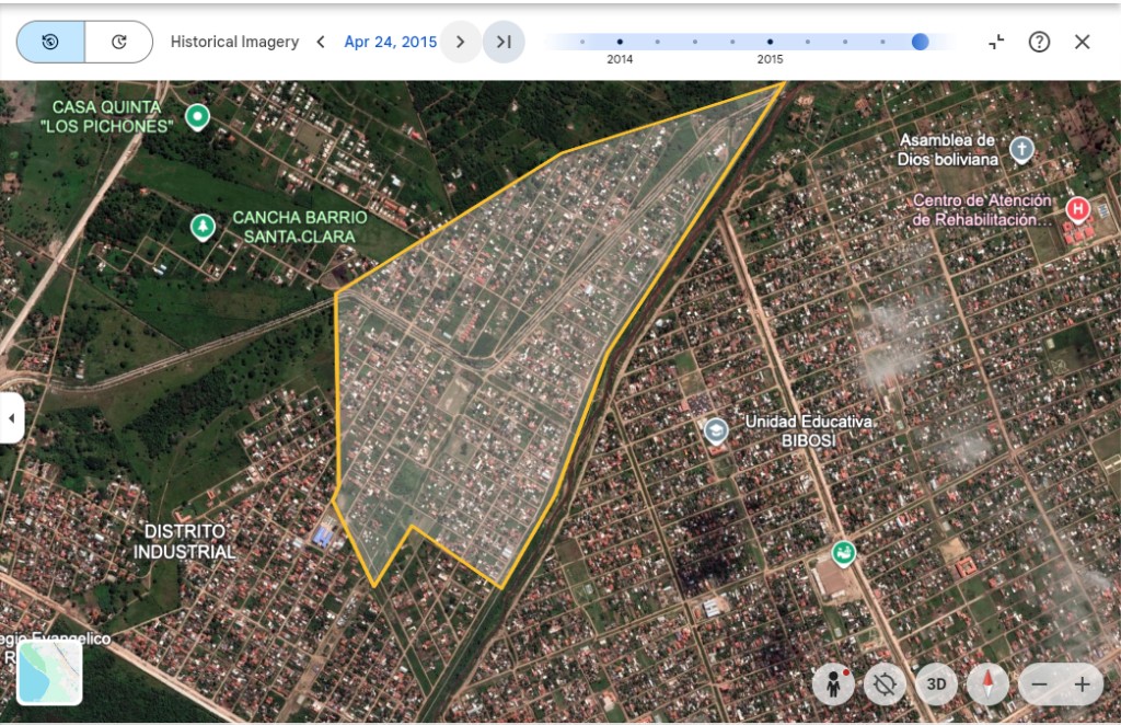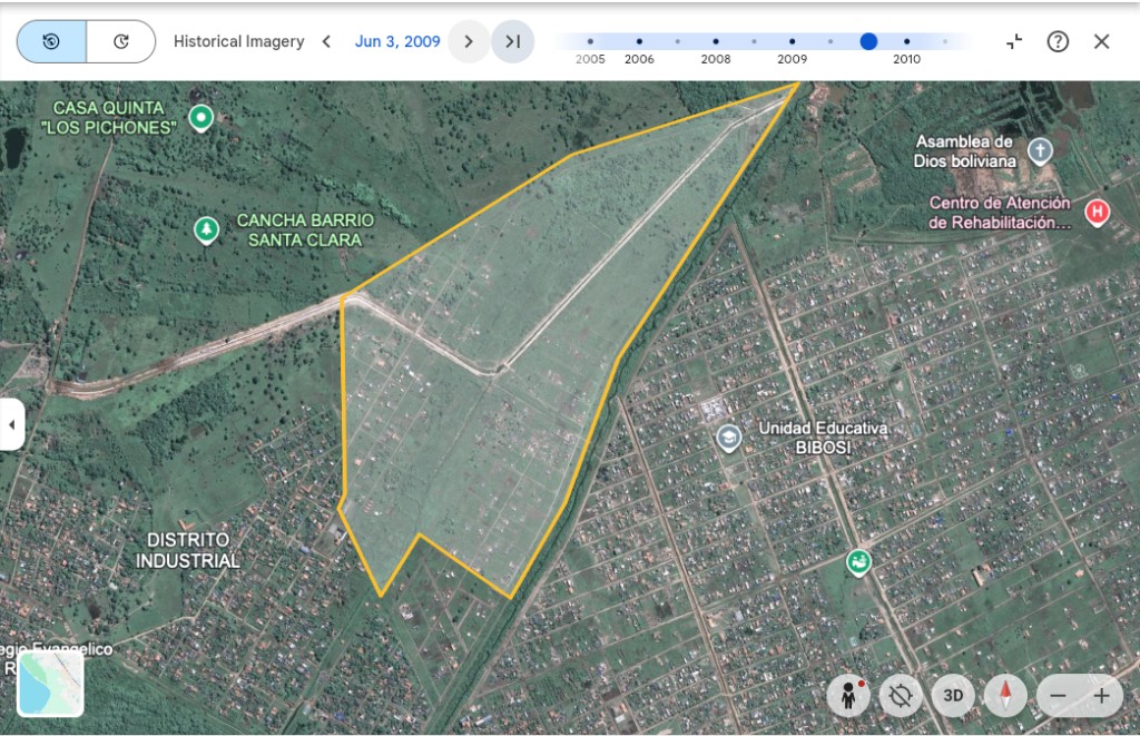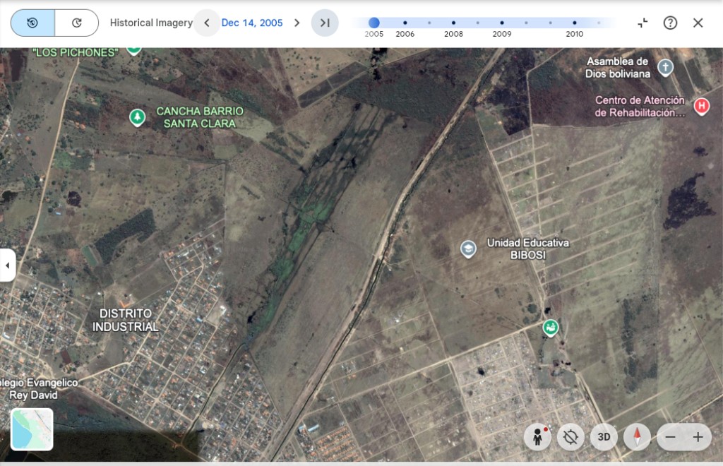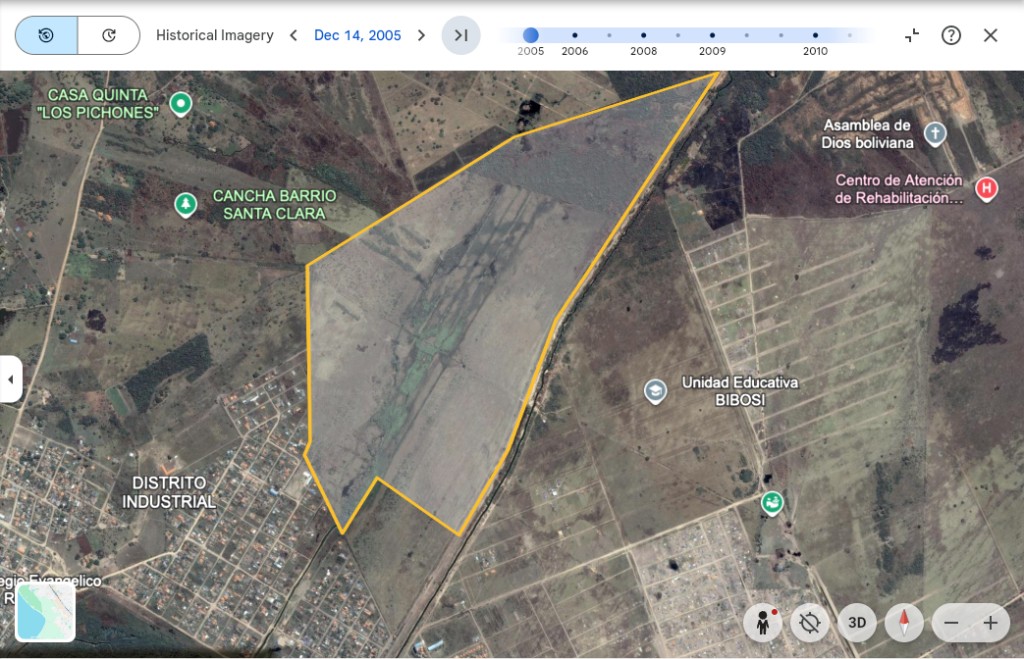 historia-01.pngGoogle Earth, imagen histórica — 14 de diciembre de 2005. Vista A. Predio delimitado; entorno Distrito Industrial, Cancha Barrio Santa Clara, BIBOSI y Canal Chivato.historia-02.pngGoogle Earth, imagen histórica — 14 de diciembre de 2005. Vista B. Predio delimitado; entorno Distrito Industrial, Cancha Barrio Santa Clara, BIBOSI y Canal Chivato.historia-03.pngGoogle Earth, imagen histórica — 27 de enero de 2006. Vista A. Terreno aún poco urbanizado dentro del perímetro.historia-04.pngGoogle Earth, imagen histórica — 27 de enero de 2006. Vista B. Terreno aún poco urbanizado dentro del perímetro.historia-05.pngGoogle Earth, imagen histórica — 25 de mayo de 2006. Vista A. Continúa el trazado y ocupación dispersa.historia-06.pngGoogle Earth, imagen histórica — 25 de mayo de 2006. Vista B. Continúa el trazado y ocupación dispersa.historia-07.pngGoogle Earth, imagen histórica — 15 de agosto de 2008. Vista A. Cuadrícula de calles y primeras construcciones dentro del área.historia-08.pngGoogle Earth, imagen histórica — 15 de agosto de 2008. Vista B. Cuadrícula de calles y primeras construcciones dentro del área.historia-09.pngGoogle Earth, imagen histórica — 17 de abril de 2009. Vista A. Ocupación en desarrollo; límite con zona consolidada al este.historia-10.pngGoogle Earth, imagen histórica — 17 de abril de 2009. Vista B. Ocupación en desarrollo; límite con zona consolidada al este.historia-11.pngGoogle Earth, imagen histórica — 19 de abril de 2009. Vista A. Mismo año; variación de la vista histórica.historia-12.pngGoogle Earth, imagen histórica — 19 de abril de 2009. Vista B. Mismo año; variación de la vista histórica.historia-13.pngGoogle Earth, imagen histórica — 3 de junio de 2009. Vista A. Superposición verde en captura; parcelación visible.historia-14.pngGoogle Earth, imagen histórica — 3 de junio de 2009. Vista B. Superposición verde en captura; parcelación visible.historia-15.pngGoogle Earth, imagen histórica — 3 de julio de 2010. Vista A. Mayor densidad de calles y techos.historia-16.pngGoogle Earth, imagen histórica — 3 de julio de 2010. Vista B. Mayor densidad de calles y techos.historia-17.pngGoogle Earth, imagen histórica — 26 de septiembre de 2010. Vista A. Avance de la malla urbana en el predio.historia-18.pngGoogle Earth, imagen histórica — 26 de septiembre de 2010. Vista B. Avance de la malla urbana en el predio.historia-19.pngGoogle Earth, imagen histórica — 27 de febrero de 2011. Vista A. Más viviendas y calles demarcadas.historia-20.pngGoogle Earth, imagen histórica — 27 de febrero de 2011. Vista B. Más viviendas y calles demarcadas.historia-21.pngGoogle Earth, imagen histórica — 28 de septiembre de 2012. Vista A. Urbanización densa dentro del polígono.historia-22.pngGoogle Earth, imagen histórica — 28 de septiembre de 2012. Vista B. Urbanización densa dentro del polígono.historia-23.pngGoogle Earth, imagen histórica — 21 de enero de 2013. Vista A. Tejido residencial compacto.historia-24.pngGoogle Earth, imagen histórica — 21 de enero de 2013. Vista B. Tejido residencial compacto.historia-25.pngGoogle Earth, imagen histórica — 24 de enero de 2013. Vista A. Segunda toma en 2013; comparar con la anterior.historia-26.pngGoogle Earth, imagen histórica — 24 de enero de 2013. Vista B. Segunda toma en 2013; comparar con la anterior.historia-27.pngGoogle Earth, imagen histórica — 27 de julio de 2013. Vista A. Continuación del proceso de ocupación.historia-28.pngGoogle Earth, imagen histórica — 27 de julio de 2013. Vista B. Continuación del proceso de ocupación.historia-29.pngGoogle Earth, imagen histórica — 28 de julio de 2015. Vista A. Alta densidad edificada en el área marcada.historia-30.pngGoogle Earth, imagen histórica — 28 de julio de 2015. Vista B. Alta densidad edificada en el área marcada.historia-31.pngGoogle Earth, imagen histórica — 23 de octubre de 2019. Vista A. Estado reciente del sector (referencia para el litigio).historia-32.pngGoogle Earth, imagen histórica — 23 de octubre de 2019. Vista B. Estado reciente del sector (referencia para el litigio).