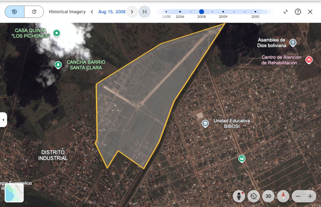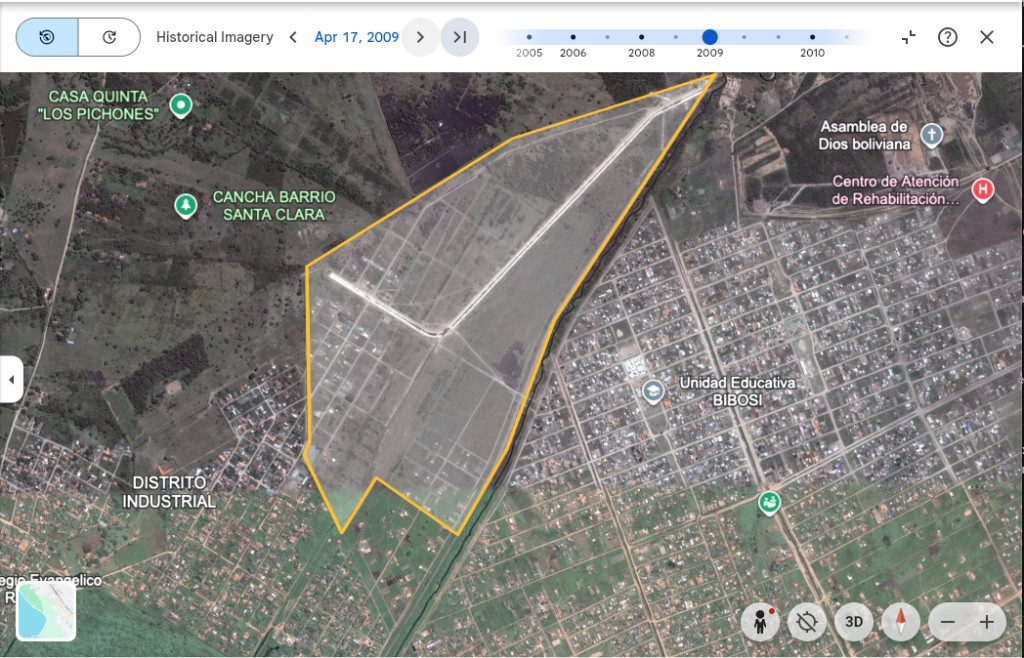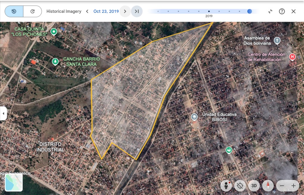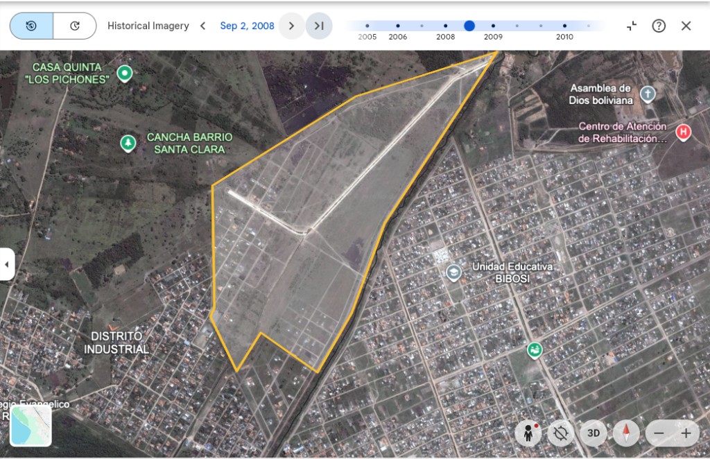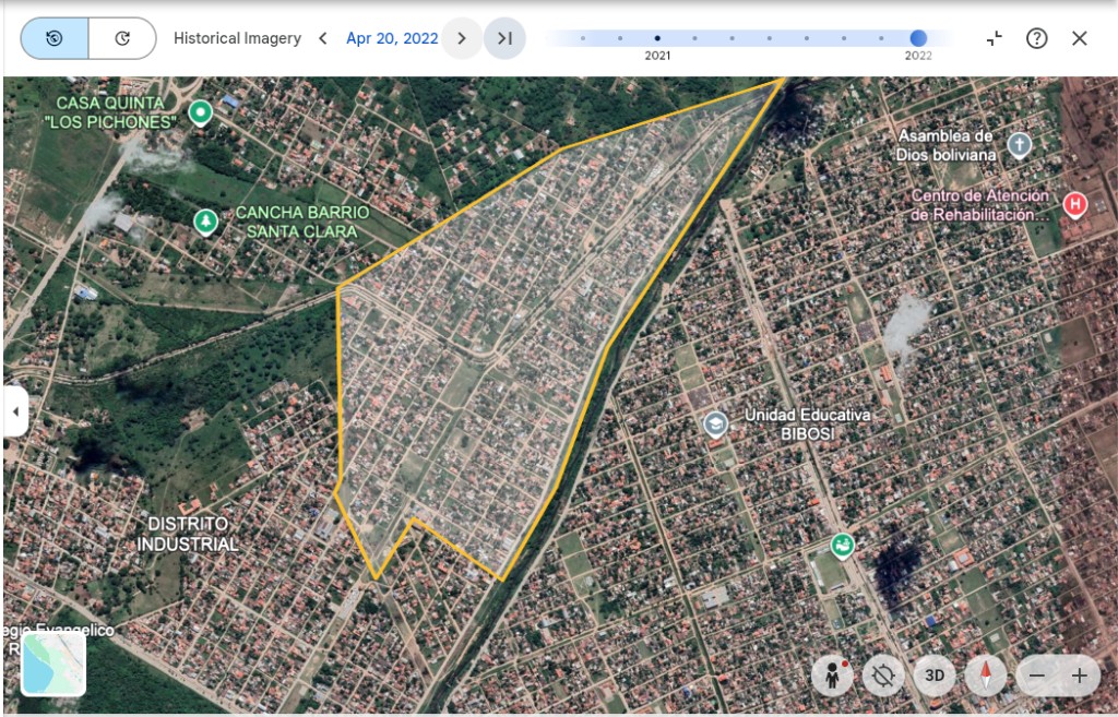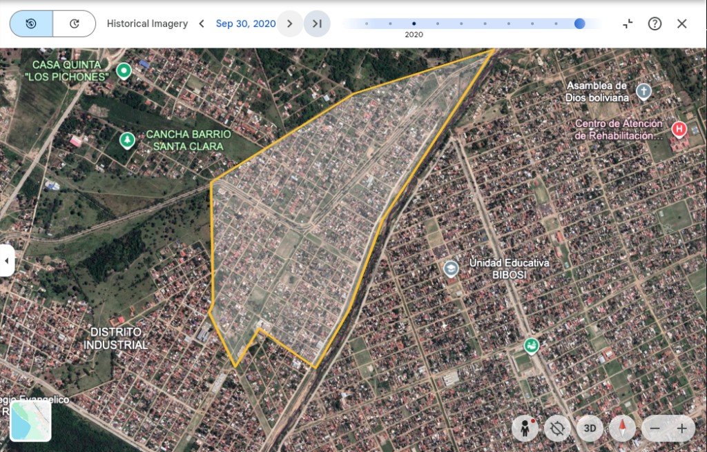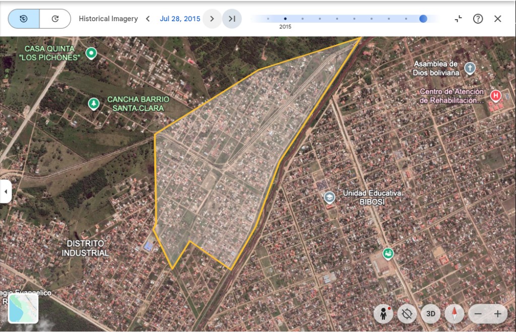 historia-01.pngGoogle Earth, imagen histórica — 14 de diciembre de 2005. Vista A. Predio delimitado; entorno Distrito Industrial, Cancha Barrio Santa Clara, BIBOSI y Canal Chivato.historia-02.pngGoogle Earth, imagen histórica — 14 de diciembre de 2005. Vista B. Predio delimitado; entorno Distrito Industrial, Cancha Barrio Santa Clara, BIBOSI y Canal Chivato.historia-03.pngGoogle Earth, imagen histórica — 27 de enero de 2006. Vista A. Terreno aún poco urbanizado dentro del perímetro.historia-04.pngGoogle Earth, imagen histórica — 27 de enero de 2006. Vista B. Terreno aún poco urbanizado dentro del perímetro.historia-05.pngGoogle Earth, imagen histórica — 25 de mayo de 2006. Vista A. Continúa el trazado y ocupación dispersa.historia-06.pngGoogle Earth, imagen histórica — 25 de mayo de 2006. Vista B. Continúa el trazado y ocupación dispersa.historia-07.pngGoogle Earth, imagen histórica — 15 de agosto de 2008. Vista A. Cuadrícula de calles y primeras construcciones dentro del área.historia-08.pngGoogle Earth, imagen histórica — 15 de agosto de 2008. Vista B. Cuadrícula de calles y primeras construcciones dentro del área.historia-09.pngGoogle Earth, imagen histórica — 17 de abril de 2009. Vista A. Ocupación en desarrollo; límite con zona consolidada al este.historia-10.pngGoogle Earth, imagen histórica — 17 de abril de 2009. Vista B. Ocupación en desarrollo; límite con zona consolidada al este.historia-11.pngGoogle Earth, imagen histórica — 19 de abril de 2009. Vista A. Mismo año; variación de la vista histórica.historia-12.pngGoogle Earth, imagen histórica — 19 de abril de 2009. Vista B. Mismo año; variación de la vista histórica.historia-13.pngGoogle Earth, imagen histórica — 3 de junio de 2009. Vista A. Superposición verde en captura; parcelación visible.historia-14.pngGoogle Earth, imagen histórica — 3 de junio de 2009. Vista B. Superposición verde en captura; parcelación visible.historia-15.pngGoogle Earth, imagen histórica — 3 de julio de 2010. Vista A. Mayor densidad de calles y techos.historia-16.pngGoogle Earth, imagen histórica — 3 de julio de 2010. Vista B. Mayor densidad de calles y techos.historia-17.pngGoogle Earth, imagen histórica — 26 de septiembre de 2010. Vista A. Avance de la malla urbana en el predio.historia-18.pngGoogle Earth, imagen histórica — 26 de septiembre de 2010. Vista B. Avance de la malla urbana en el predio.historia-19.pngGoogle Earth, imagen histórica — 27 de febrero de 2011. Vista A. Más viviendas y calles demarcadas.historia-20.pngGoogle Earth, imagen histórica — 27 de febrero de 2011. Vista B. Más viviendas y calles demarcadas.historia-21.pngGoogle Earth, imagen histórica — 28 de septiembre de 2012. Vista A. Urbanización densa dentro del polígono.historia-22.pngGoogle Earth, imagen histórica — 28 de septiembre de 2012. Vista B. Urbanización densa dentro del polígono.historia-23.pngGoogle Earth, imagen histórica — 21 de enero de 2013. Vista A. Tejido residencial compacto.historia-24.pngGoogle Earth, imagen histórica — 21 de enero de 2013. Vista B. Tejido residencial compacto.historia-25.pngGoogle Earth, imagen histórica — 24 de enero de 2013. Vista A. Segunda toma en 2013; comparar con la anterior.historia-26.pngGoogle Earth, imagen histórica — 24 de enero de 2013. Vista B. Segunda toma en 2013; comparar con la anterior.historia-27.pngGoogle Earth, imagen histórica — 27 de julio de 2013. Vista A. Continuación del proceso de ocupación.historia-28.pngGoogle Earth, imagen histórica — 27 de julio de 2013. Vista B. Continuación del proceso de ocupación.historia-29.pngGoogle Earth, imagen histórica — 28 de julio de 2015. Vista A. Alta densidad edificada en el área marcada.historia-30.pngGoogle Earth, imagen histórica — 28 de julio de 2015. Vista B. Alta densidad edificada en el área marcada.historia-31.pngGoogle Earth, imagen histórica — 23 de octubre de 2019. Vista A. Estado reciente del sector (referencia para el litigio).historia-32.pngGoogle Earth, imagen histórica — 23 de octubre de 2019. Vista B. Estado reciente del sector (referencia para el litigio).